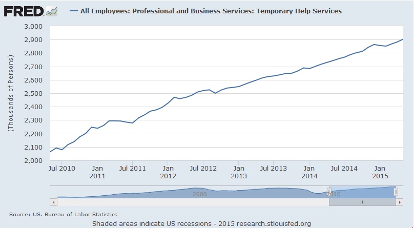 Here is Federal Reserve Economic Data (FRED) on the number of temp help since Jul. 2010: