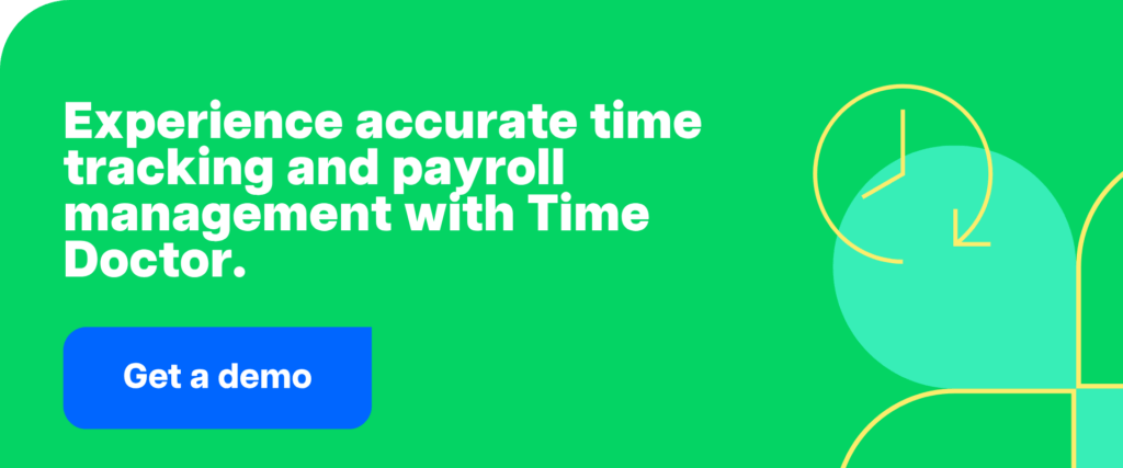 Payroll, time tracking, and time clock software, like Time Doctor, help businesses automatically record employee work hours and generate accurate, compliant payrolls. By replacing manual timesheets with digital tracking, Time Doctor gives HR and finance teams real-time visibility, fewer errors, and more time to focus on strategic work — all while ensuring fairness and trust in every pay cycle.