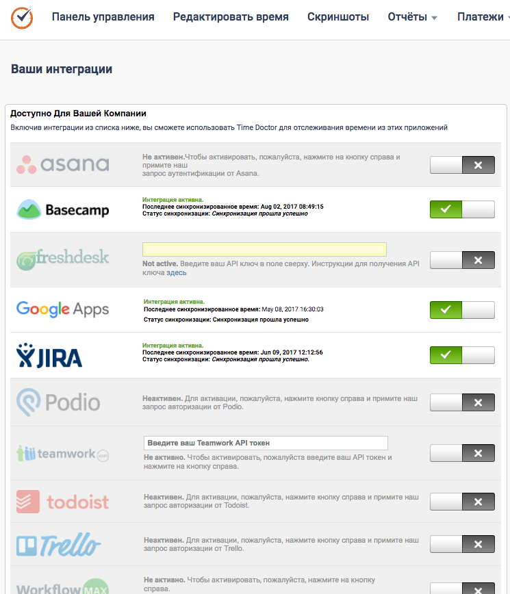 Лучше всего сразу интегрировать таск менеджер в тайм трекер. Даже если вы не платите сотрудникам по часам, будет полезно знать, насколько эффективно они работают. Например, Тайм Доктор автоматически интегрируется с самыми популярными таск менеджерами.